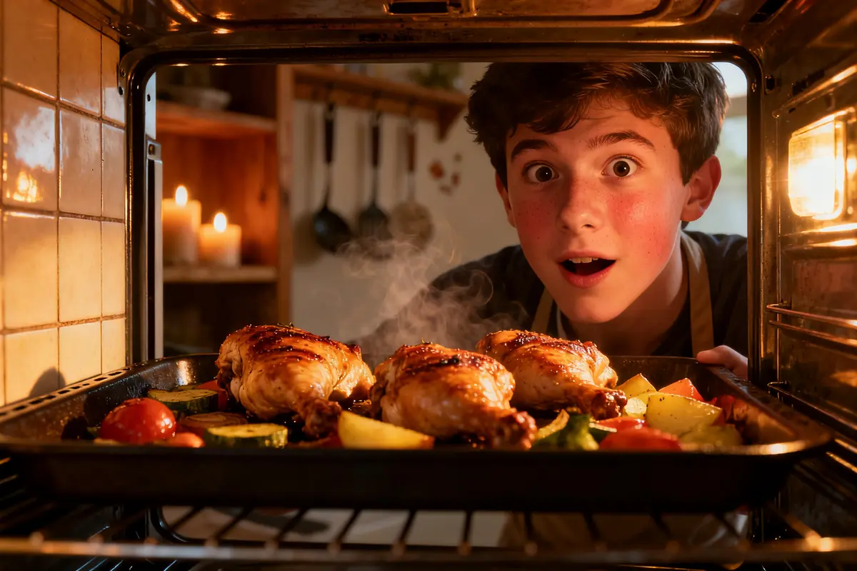 Enfournez à 180 °C pendant 35 minutes. Le poulet devient doré, les légumes confisent doucement. Votre plat est prêt.