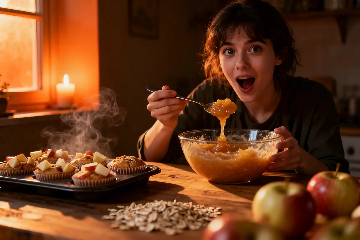 La structure repose sur un équilibre simple. La compote hydrate. Les flocons absorbent une partie de cette humidité. Ils apportent de la tenue sans alourdir la mie. Les morceaux de pomme créent des zones fondantes. Le dessus dore légèrement. Ce contraste donne un muffin réconfortant et généreux.